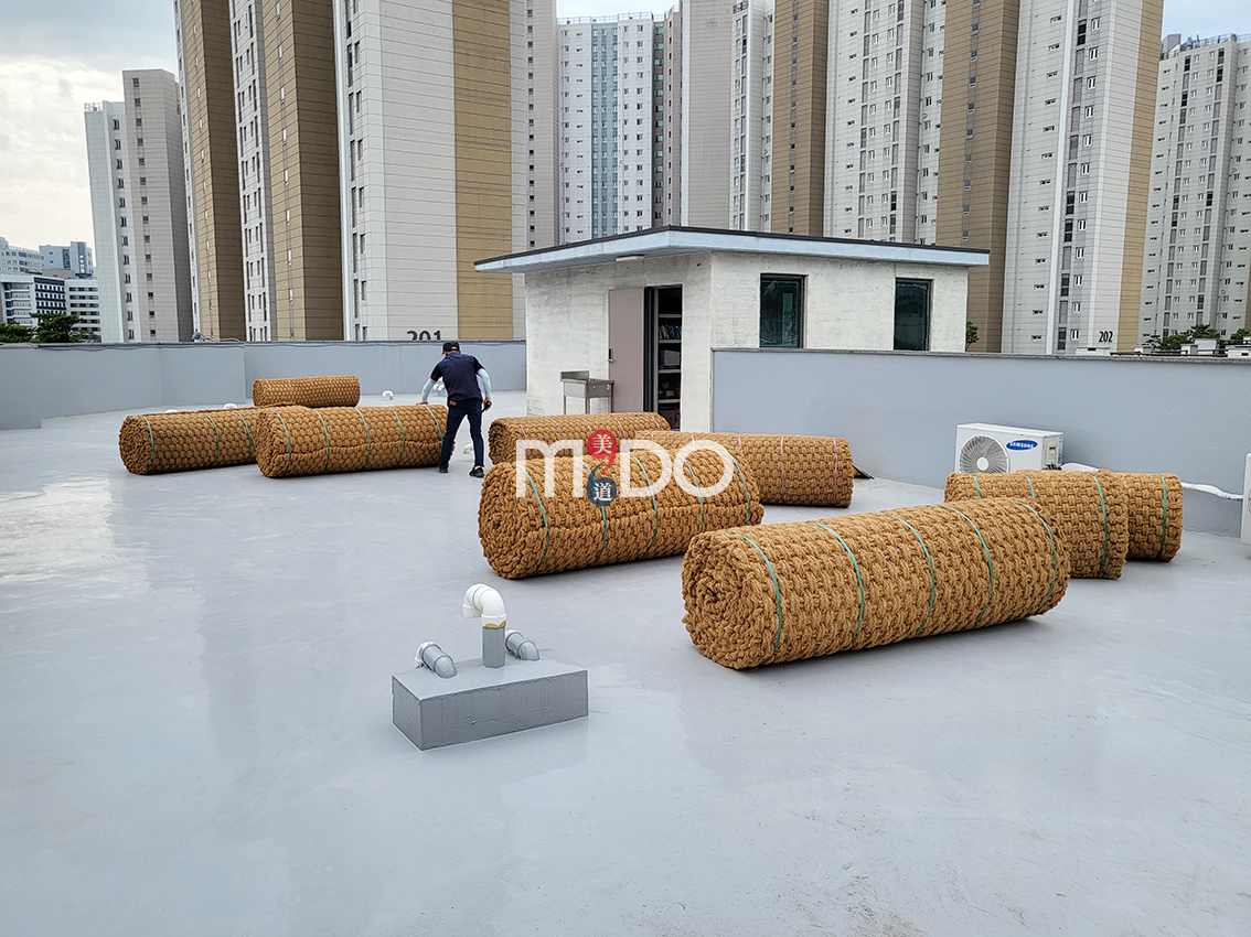옥상 야자매트 시공이 비 때문에 하루 반나절 만에 완료되었습니다.