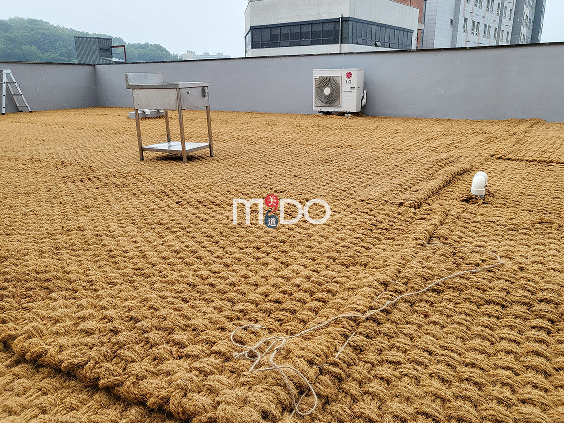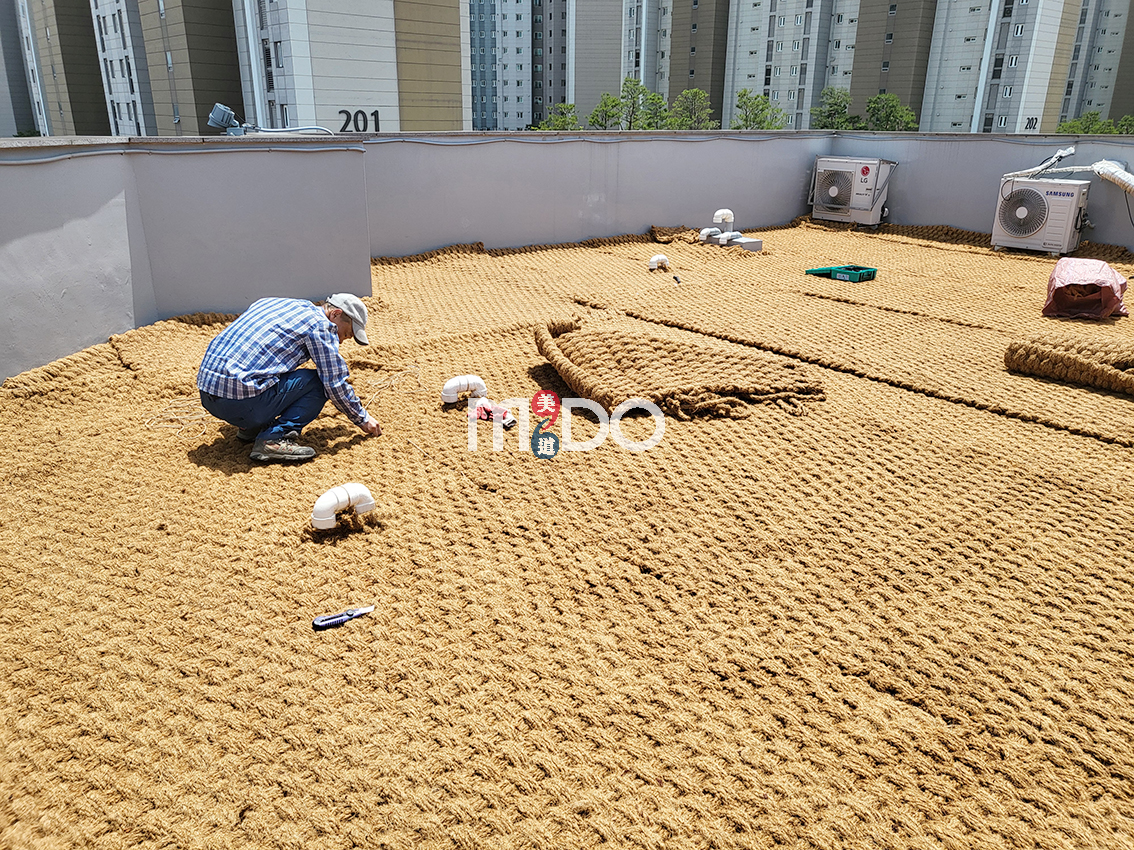 옥상이나 콘크리트 바닥에 야자매트를 시공할 때는 매트와 매트끼리 바느질해서 꿰매 주어야 합니다.
