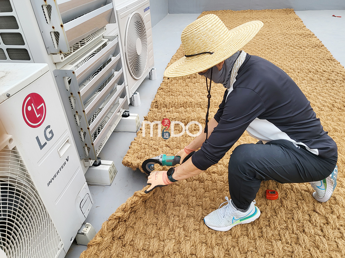 에어컨 실외기가 많아 절단한 자투리 야자매트를 꼼꼼하게 정리하고, 야자매트 전체를 바느질해서 꿰매주다 보니 시간이 많이 소요되었습니다.