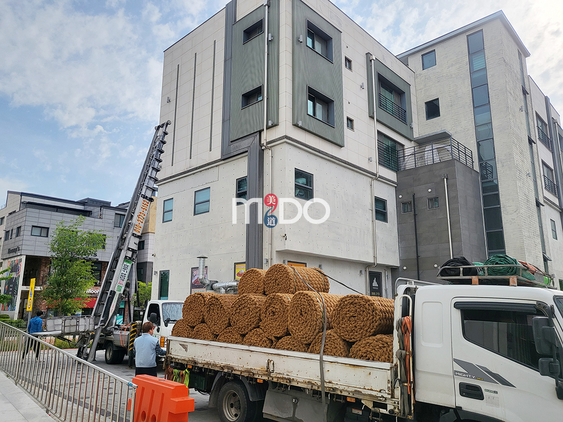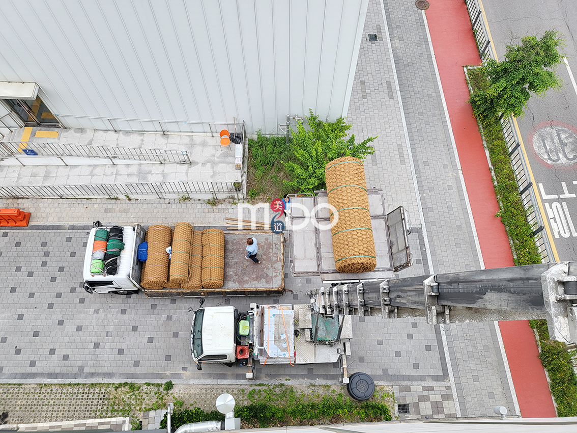 옥상으로 올릴 때는 사다리차가 있어야 쉽게 올립니다. 그런데 3롤 남겨 놓고 사다리차가 고장이 나서 다른 사다리차가 와서 남은 야자매트를 올려 주어 운반은 무사히 끝났습니다.